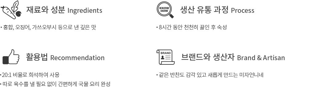 평소 요리를 자주 하는 분이라면 육수의 중요성에 대해서도,또 육수 내기의 번거로움에 대해서도 잘 아실 거예요. 육수 한 번 내기 위해 야채며 멸치를 손질하고,뒷정리를 하고,식히는 일을 생각하기만 해도 귀찮은 마음이 절로 들죠. 그렇다고 대충대충 요리하기는 싫은 분들을 위해 미자언니네의 만능 육수를 소개할게요. 미자언니네는 대파와 양파,홍합에 오징어 및 각종 향신료 등 수십 가지 재료를 더해 8시간 동안 천천히 끓였습니다. 끓이는 동안 맛과 향이 농축된 육수는 숙성 과정을 거쳐 한층 풍미가 깊어요. 물에 희석하여 육수를 내셔도 좋고,맛간장처럼 음식의 간을 맞추는 용도로 사용해보세요. 잔치국수,미역국,어묵탕 등의 국물요리에서 볶음 요리까지 다양한 음식의 맛을 간단하게 살릴 수 있답니다.