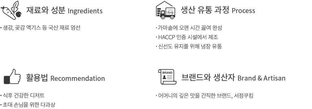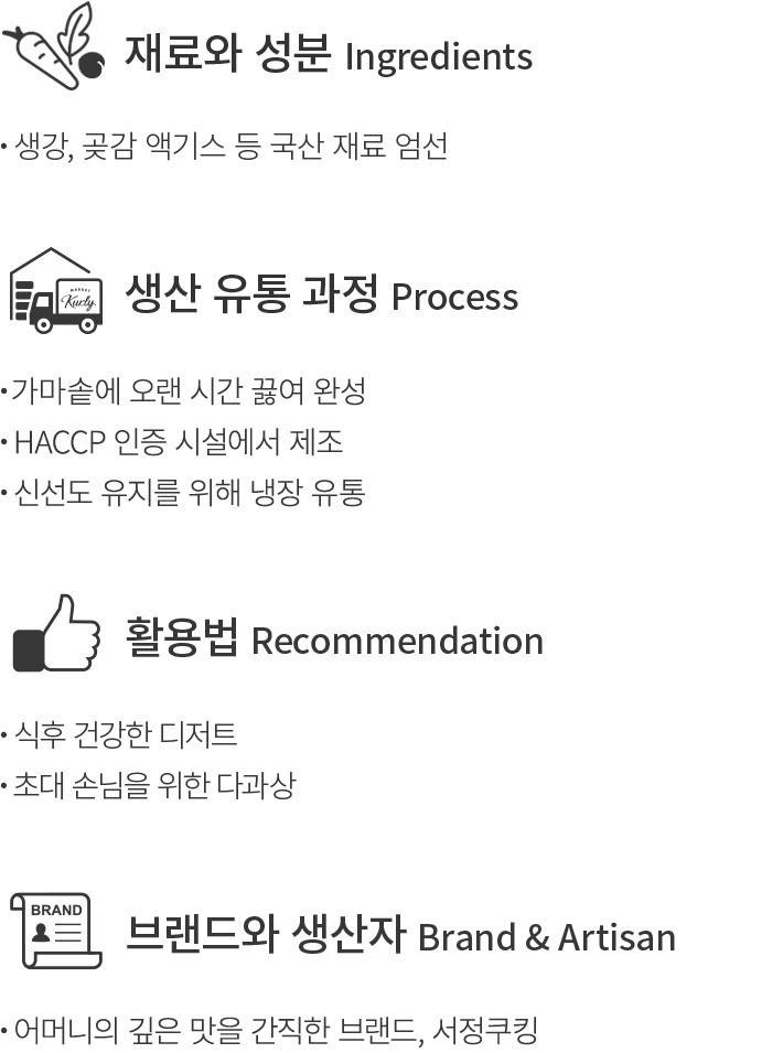 수정과는 한번 맛보면 쉬이 잊히지 않는 맵싸하면서도 달곰한 향내를 풍깁니다. 서정쿠킹의 느린 수정과는 다소 느리더라도 시간을 들여 제대로 만든 제품입니다. 30년간 한식을 연구해 온 서정옥 대표는 대량 생산이 아닌 홈메이드 방식을 추구하고 있어요. 커다란 가마솥에 얇게 저민 생강과 계피를 넣고 오랜 시간 끓여 알싸한 맛을 내고,곶감 액기스와 흑설탕을 넣고 한 번 더 푹 끓여 깊이가 있는 단맛을 더했답니다. 말간 수정과에 잣 또는 말린 대추를 띄워 마셔보세요. 떡과 곁들여 다과상으로 즐기거나 식사 후 입안을 개운하게 만들어주는 후식으로 활용해보세요.