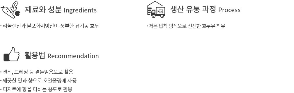 갓 수확한 신선한 호두의 상앗빛 속살을 깨문 듯 부드럽고 향긋한 유기농 오일을 컬리가 선보일게요. 유기농 호두를 냉압착하여 식물성 불포화지방산과 비타민E,알파리놀렌산 등의 영양소를 오롯이 담아냈어요. 고소하면서도 깔끔하게 넘어가는 호두오일의 맛을 그대로 보여주듯 가벼운 금빛이 감도는 투명한 색을 띠고 있답니다. 파릇하고 강렬한 풍미가 도드라지는 엑스트라버진 올리브오일에 비해 훨씬 매끄러운 목넘김을 가지고 있어 생식,오일풀링,드레싱 등으로 다양하게 활용하기 좋아요. 베이킹을 할 때 바닐라 오일 대신 고소한 향을 더하는 용도로도 꼭 알맞답니다.