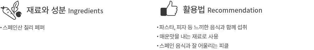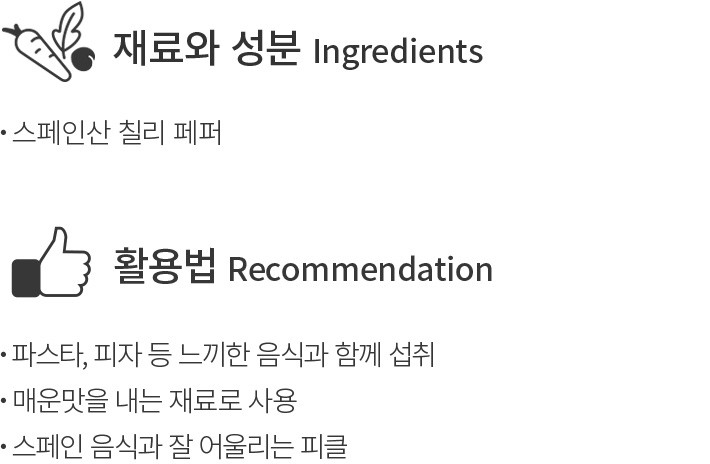 피클은 기름진 음식을 먹었을 때 느끼함을 가시게 해 주지만 음식의 맛을 한 층 돋보이게 하는 역할을 하기도 하지요. 컬리는 알싸한 맛을 지닌 뱅고어 핫칠리 페퍼를 준비했습니다. 스페인 남부지방에서 나고 자란 초록색 칠리 고추를 슬라이스 하지 않고 통으로 식초에 절여 만들었어요. 이름처럼 매콤함을 지니고 있기 때문에 피자,파스타와 같은 음식에 곁들여 먹기 좋아요. 특히 스페인산 고추답게 빠에야와 같은 스페인 음식과 훌륭한 조화를 이룬답니다. 꼭 곁들이는 용도가 아니어도 매운맛을 내고 싶은 요리에 토핑이나 음식 재료로 사용할 수 있어요.