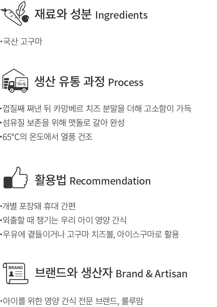 아이가 하나씩 쏙 빼 먹기 좋은 건강 간식을 소개할게요. 국내에서 재배한 고구마를 쪄서 만든 룰루맘의 리얼이구마예요. 껍질째 찐 고구마의 껍질을 벗겨 수분과 섬유질 등의 영양소가 빠져나가지 않도록 맷돌로 으깬 뒤 뭉치고,카망베르 치즈를 더해 완성했어요. 식품첨가물을 첨가하지 않고,10시간동안 65℃의 온도에서 열풍 건조하여 고구마 본연의 단맛을 최대한 보존했습니다. 20g 소용량으로 개별 포장해 휴대도 간편하지요. 외출할 때 아이의 간식으로,또 출출한 우리 가족의 주전부리로도 제격인 리얼이구마를 컬리에서 만나보세요.