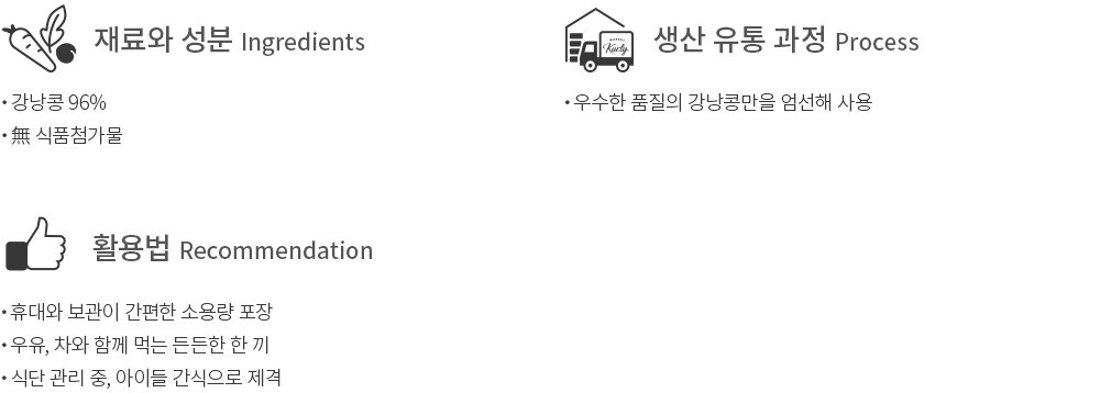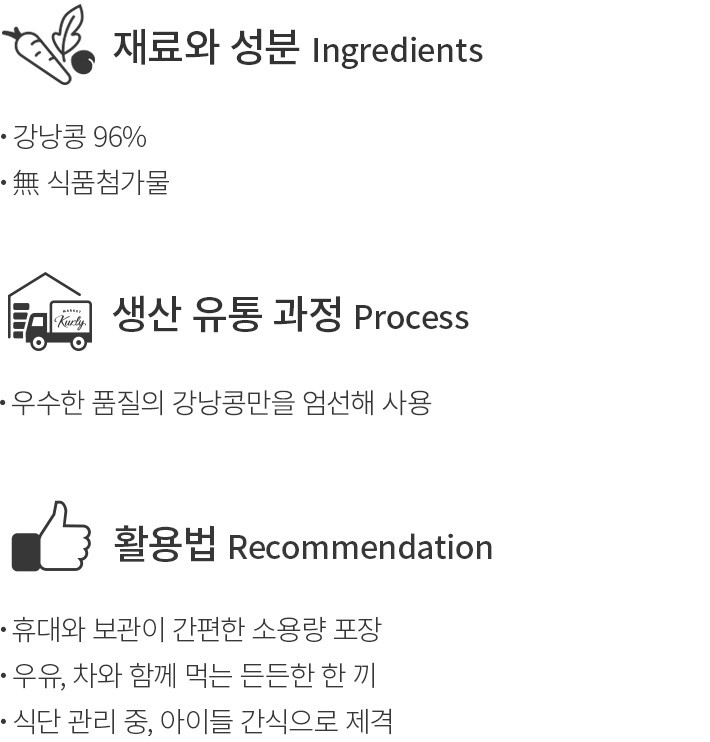 이제 가볍게 즐기기 좋은 간식으로 콩을 선택하는 분들이 많아졌어요. 단백질 함량이 높아 양질의 영양을 섭취하기 좋기 때문인데요. 컬리는 상온보관으로 간편함을 더한 더리얼 한입 찐 강낭콩을 준비했습니다. 품질 좋은 검정 강낭콩만을 선별해 알맞은 시간 푹 쪄낸 상품이에요. 한 입 배어물면 달콤함이 깃든 보슬보슬한 식감을 느낄 수 있답니다. 가방에 쏙 넣어 다니기 좋도록 소용랑 포장했으니,어디서든 우유나 두유 등을 곁들여 더욱 든든하게 즐겨보세요.