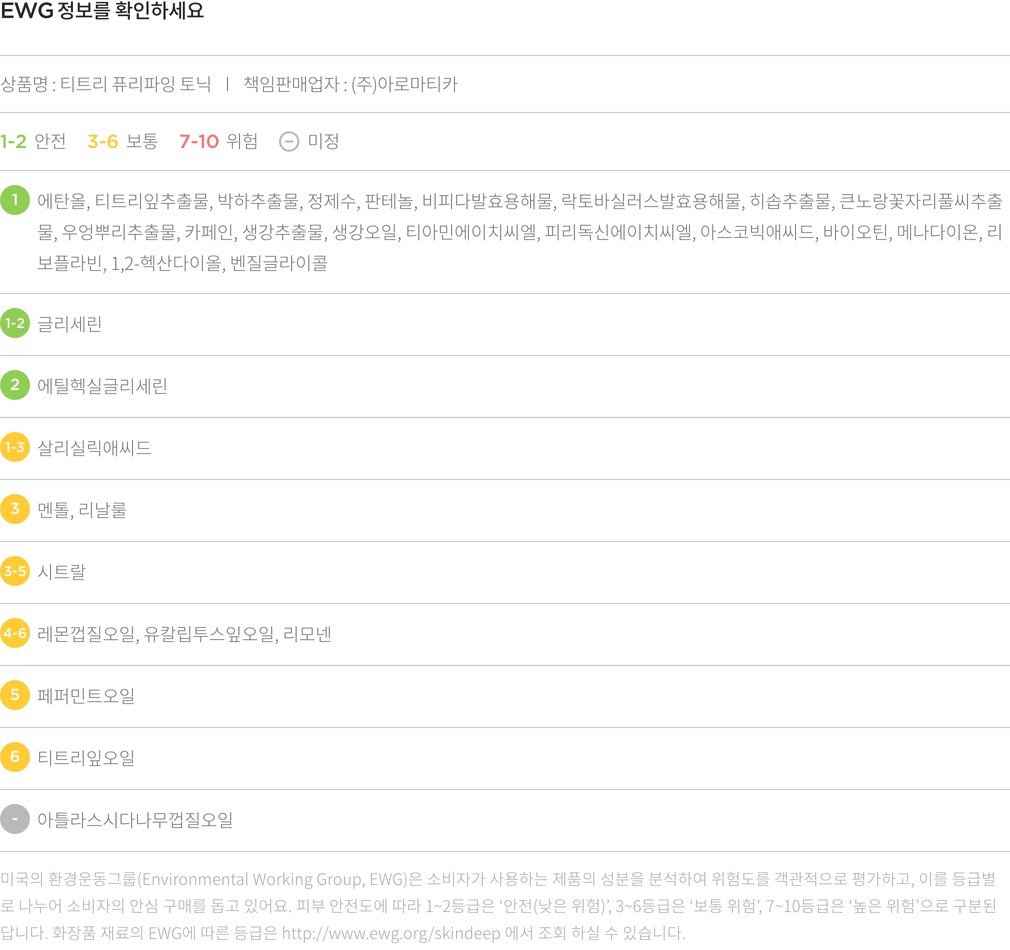 EWG에 대한 컬리의 생각 컬리는 화장품,샴푸,치약,세제 등 우리의 인체에 닿는 리빙 제품의 전성분을 공개하고 성분의 위험 정도를 EWG 기준에 따라 1~10 숫자로 안내하고 있습니다. EWG가 세계적으로 널리 사용되는 신뢰할 수 있는 척도인 것은 맞지만,상품의 안전성을 증명하는 절대적인 기준은 아니에요. EWG로부터 좋지 못한 평가를 받은 성분에 대해 전문가와 유관기관은 '권고 기준치를 지켜 사용할 경우 무해하다'고 평가하기도 합니다. 이에 컬리는 EWG 등급과 인터넷에 떠도는 단편적인 정보에만 의존하지 않고 식품의약품안전처,에코서트(ECOCERT),미국식품의약국(FDA),미국화장품원료검토위원회(CIR)등 공신력 있는 인증기관의 의견을 참고하여 유해성 여부를 꼼꼼하게 따져 보고 있습니다.
