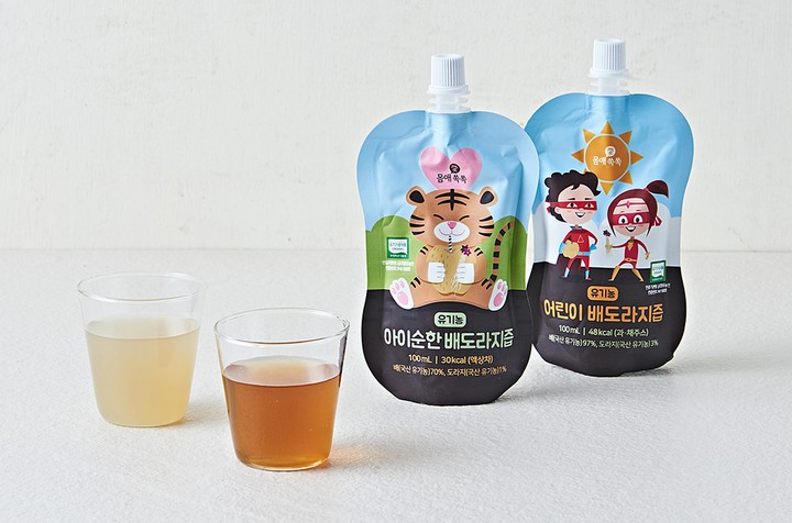 아이들이 먹을 식품이라면 아이들의 눈높이를 맞추는 것이 중요해요. 디자인부터 맛,그리고 편리함까지 하나하나 신경 쓸게 많지요. 몸애쏙쏙은 아이들을 위한 맞춤형 배도라지즙을 선보입니다. 식품첨가물 없이 계약재배를 통해 수급된 국산 유기농 배와 도라지만을 착즙해 사용한 유기농 어린이 배도라지즙이에요. 아이들의 마음을 사로잡을 아기자기한 캐릭터를 그려 넣었는가 하면,스파우트 파우치에 담아 마시기 편하도록 만들었어요. 도라지의 쌉싸름한 맛을 어려워하는 아이들을 위한 순한 아이 배도라지즙과 정제수 없이 달콤 쌉싸름함을 오롯이 담아낸 어린이 배도라지즙 2종 중 선택해보세요. 10포 알뜰하게 상자에 담아 보내드리니 선물용으로도 손색없어요.