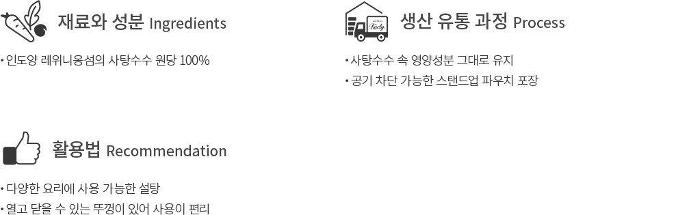 ・특징:순도 100%의 사탕수수로만 만들어진 정제되지 않은 설탕을 스탠드업 파우치에 포장한 상품입니다.