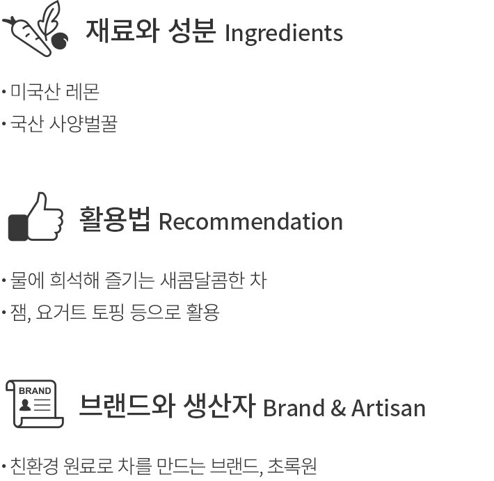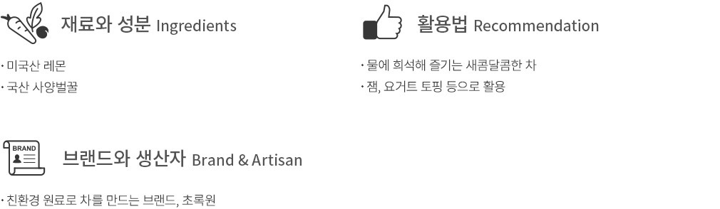 초록원은 햇살을 가득 받으며 자라난 레몬 과육을 달콤하게 절여낸 레몬차를 준비했습니다. 여기에 국산 사양벌꿀을 함께 넣어 깊은 맛을 더했지요. 레몬 특유의 상큼한 맛이 입맛을 돋우어주는 것은 물론,씹는 맛까지 즐길 수 있어요. 생각이 날 때마다 타 드실 수 있도록 넉넉한 용량으로 담았고요. 한 모금 두 모금 마시다 보면 온몸에 달콤한 기운을 금세 불어넣을 수 있을 거예요.