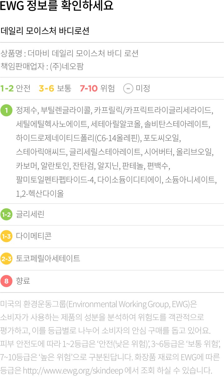 컬리는 EWG로부터 보통,위험 등급을 받은 성분이라 하더라도 숨기지 않고 정직하게 공개합니다. 더불어 우려되는 성분에 대한 정보를 함께 제공해 드리오니 구입 전 반드시 확인해 주세요.
