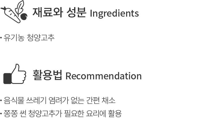 ・특징:유기농 청양고추 10~12개 정도를 잘게 썰어 냉동한 제품이에요.