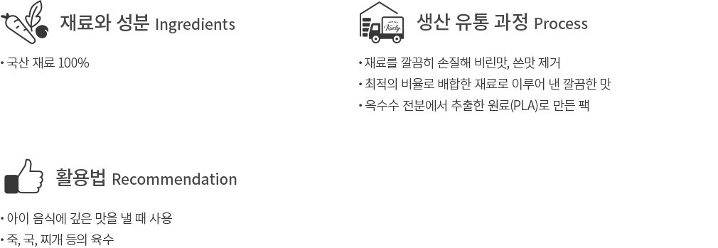 이유식을 시작한 우리 아이의 음식에도 깊은 맛이 필요한 법이죠. 컬리는 자극적이지 않고 순한 국물을 우려낼 아이용 육수 다시팩을 준비했어요. 다시마,멸치,사과,쌀,우엉,파 6가지 재료를 모두 국산으로 엄선한 뒤 최적의 비율로 배합하여 팩 하나에 담아냈지요. 멸치의 내장을 제거하고,우엉을 볶는 등 재료를 세심하게 손질하여 비리거나 쓴맛을 최소화했답니다. 팩은 옥수수 전분에서 추출한 원료로 만들어졌기에 안심이고요. 티백 형태라 국물을 우려낸 뒤 건져내기만 하면 맑고도 진한 국물이 금세 완성될 거예요. 이유식이나 아이의 국,죽 등을 만들 때 손쉽게 활용해보세요.