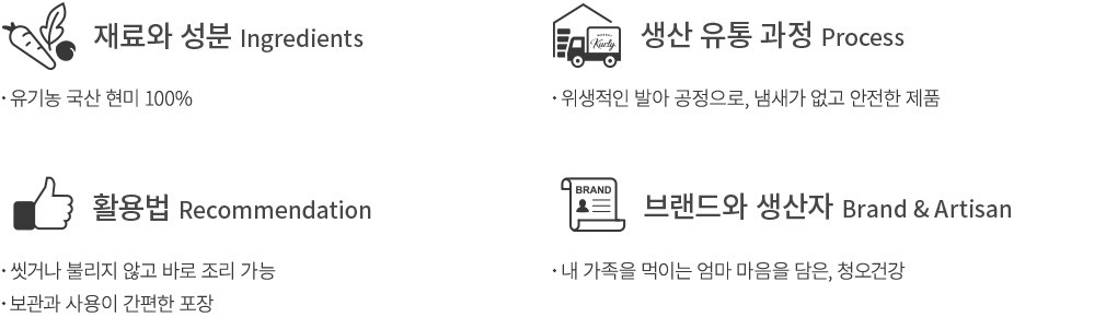 쌀,보리,콩 등 곡류는 정제되지 않은 자연 그대로의 상태일 때 영양이 가장 풍부하다고 하죠. 그래서 건강을 생각하면 현미밥을 챙기게 되지만,가슬가슬한 식감과 소화가 잘 안 되는 단점 때문에 굳은 결심이 흔들리게 되는데요. 청오건강의 유기농 발아현미는 특수한 발아 공정을 거치면서 식감은 부드러워지고 영양소는 더욱더 풍부해졌어요. 오랜 시간 불려야 하는 기존 현미와 달리,씻거나 불리지 않아도 되니 준비하기도 훨씬 수월하죠. 유기농이라서 잡곡을 시작하는 이유식에도 안심하고 쓸 수 있어요. 입맛에 맞게 흰쌀에 현미를 섞거나 현미만으로 맛도 더 좋고 영양도 높인 밥을 지어보세요.