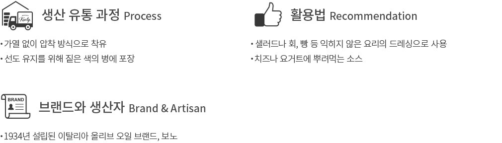 ・특징:필터링을 하지 않아 과육의 흔적이 느껴지는 엑스트라 버진 올리브 오일이에요.