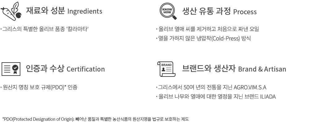 올리브 나무와 올리브 열매에 대한 사랑,깊은 지식으로 제품의 모든 제조과정에 힘을 쓰는 열정적인 브랜드입니다. 일리아다(ILIADA) 브랜드 제품을 생산하는 AGRO.VIM.S.A사는 1964년 설립되어 50년 전통을 지닌 곳으로,전 세계에 올리브 오일을 수출하고 있습니다. 뛰어난 제품 특징을 유지하면서 전통성이 손상되지 않게,수확부터 품질 검사까지 하나하나 수작업으로 꼼꼼히 생산합니다.