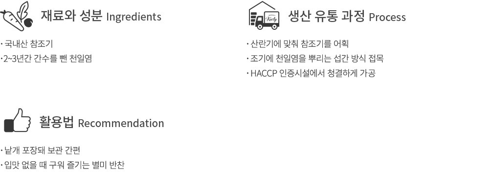 ・해동법:해동하지 않고 바로 조리해 드셔도 좋습니다. 해동하실 거라면 드시기 10~20분 전 상온에 굴비를 꺼내 놓은 뒤 키친타월로 물기를 닦고 구워 드세요.