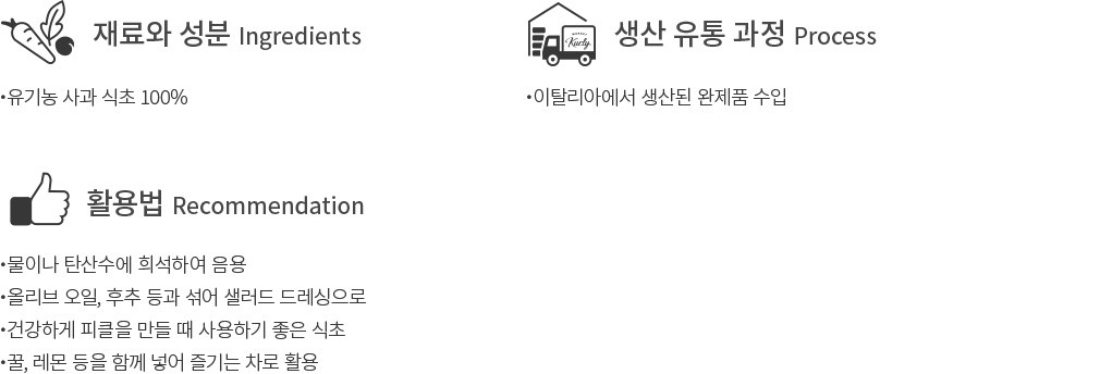 새콤한 풍미를 지닌 식초 중에서도,산뜻한 단맛이 특징인 과일 식초는 두루 활용하기 좋은데요. 지금 소개하는 비비베르데의 식초는 유기농 사과만을 담아 더욱 안심하고 사용할 수 있는 제품이에요. 발효 과정에서 자연스레 생성되는 '초모'가 살아 있는 식초라 더욱 특별하지요. 드레싱으로 만들어 요리에 더하거나 피클 등을 만들 때 사용해 보세요. 그대로 물에 타 드셔도 새콤달콤한 맛을 오롯이 즐길 수 있을 거예요.