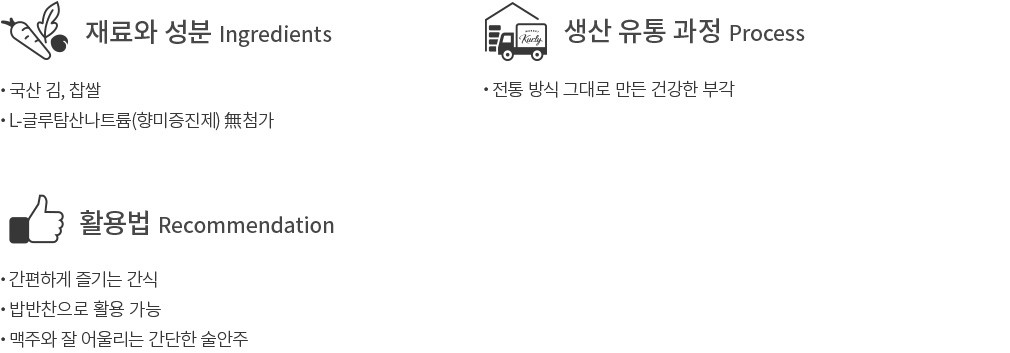 ・특징:국산 김에 찹쌀풀을 발라,유채유로 바삭하게 튀겨낸 부각이에요. 고소한 김의 풍미와 바삭한 식감이 잘 어울려요.