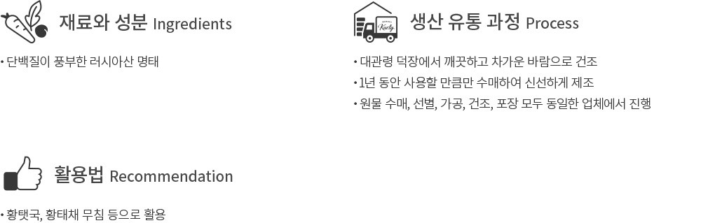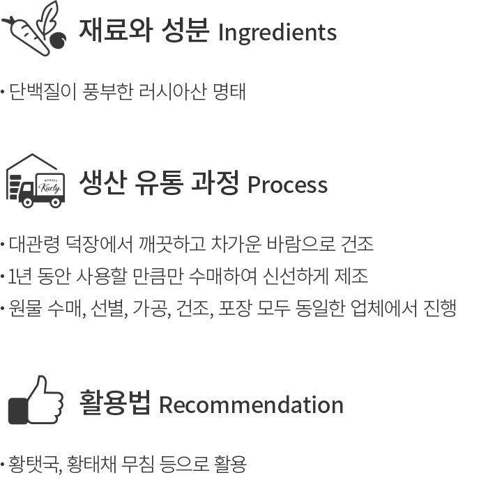 ?특징:러시아산 명태를 대관령에서 건조한 후,속살만 따로 골라내 채 형태로 가공한 황태채입니다. 100g으로 소포장해 1~2인 가구가 사용하기에 좋아요.