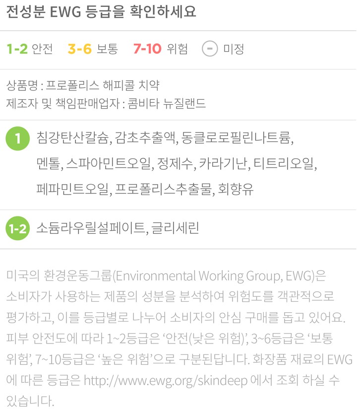 EWG에 대한 컬리의 생각 컬리는 화장품,샴푸,치약,세제 등 우리의 인체에 닿는 리빙 제품의 전성분을 공개하고 성분의 위험 정도를 EWG 기준에 따라 1~10 숫자로 안내하고 있습니다. EWG가 세계적으로 널리 사용되는 신뢰할 수 있는 척도인 것은 맞지만,상품의 안전성을 증명하는 절대적인 기준은 아니에요. EWG로부터 좋지 못한 평가를 받은 성분에 대해 전문가와 유관기관은 '권고 기준치를 지켜 사용할 경우 무해하다'고 평가하기도 합니다. 이에 컬리는 EWG 등급과 인터넷에 떠도는 단편적인 정보에만 의존하지 않고 식품의약품안전처,에코서트(ECOCERT),미국식품의약국(FDA),미국화장품원료검토위원회(CIR) 등 공신력 있는 인증기관의 의견을 참고하여 유해성 여부를 꼼꼼하게 따져 보고 있습니다.