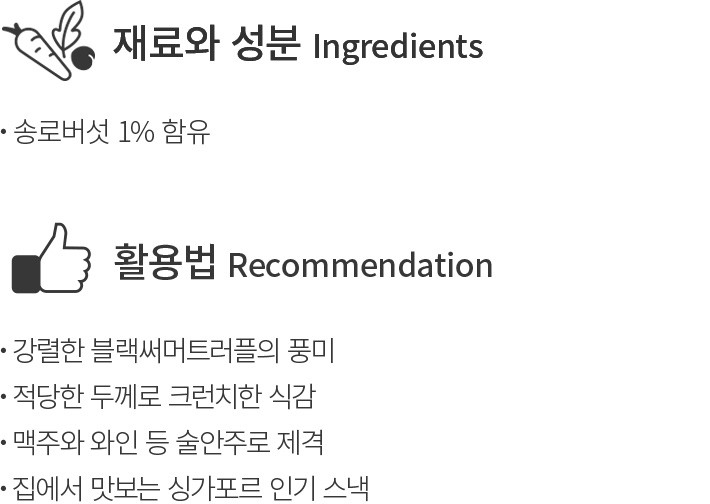 ?특징:강렬한 블랙써머트러플의 향을 풍기는 감자칩입니다. 너무 얇지 않은 적당한 두께로 식감을 살렸어요.