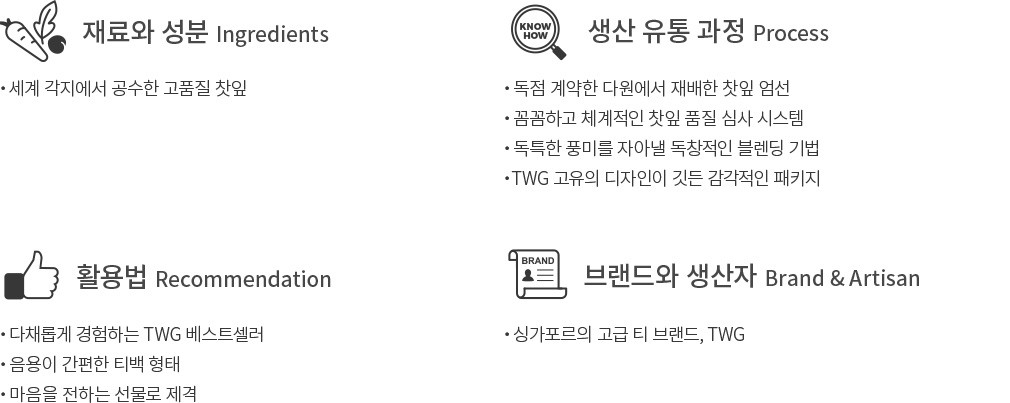 차 한 잔은 하루의 분위기를 변화시킬 만큼 영향력을 지니고 있습니다. 기억에 남는 티타임을 선사해 줄 TWG의 베스트셀러 6종을 선보일게요. 동서양 차 무역의 중심,싱가포르의 고급 티 브랜드 TWG는 찻잎을 섞지 않는 단일 차를 원칙으로,독점 계약한 다원에서 재배한 찻잎만을 고집합니다. 재료 본연의 독보적인 맛과 풍미를 그대로 표현하는 TWG만의 블렌딩 기법은 '차'를 사랑하는 전문가들의 노력과 애정의 산물이라고 볼 수 있지요. 간편하게 즐길 수 있도록 티백에 담았으니,취향대로 고른 차를 다양한 형태로 음미해 보세요. 도화지에 물감을 칠한 듯,평범했던 하루가 다채롭게 물들어갈 거예요.