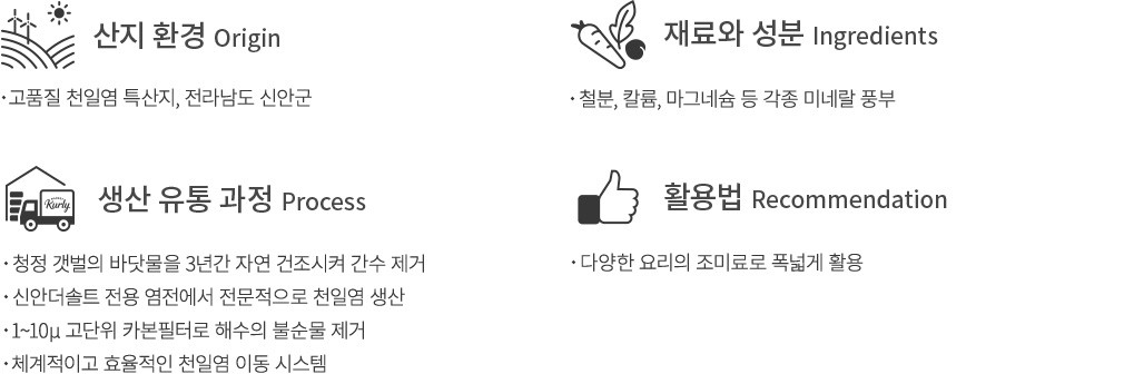 ・특징:전라남도 신안군의 청정 갯벌에서 3년동안 바닷물로부터 간수를 분리 및 제거해 만든 천일염이에요. 쓴맛과 짠맛이 많이 강하지 않으며,고소하고 부드러운 풍미가 은은하게 전해집니다.