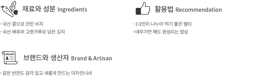 그냥 먹어도 좋은 비지찌개에 김치를 넣어 끓이면 은근히 얼큰한 맛이 마음까지 따뜻하게 데워주지요. 미자언니네는 우리콩 비지에 우리 김치를 더해 담백하고 칼칼한 비지찌개를 완성했습니다. 국산 대두로 만든 비지는 고소하고,국산 고춧가루와 배추를 사용한 김치는 식감과 깊은 맛을 더하죠. 여기에 미자언니네의 특제 맛육수와 꽃게 액젓을 더해 슴슴한 듯 깔끔한 감칠맛이 일품이에요. 잘 끓여 밥에 비비기만 해도 뚝딱 한 그릇이 비워진답니다.