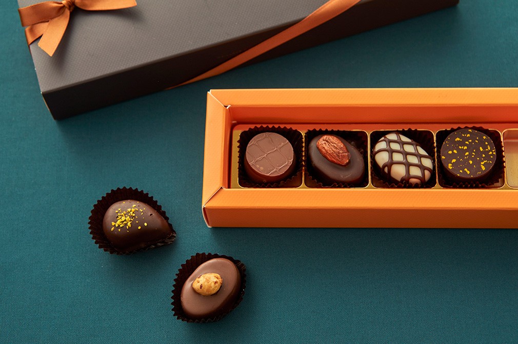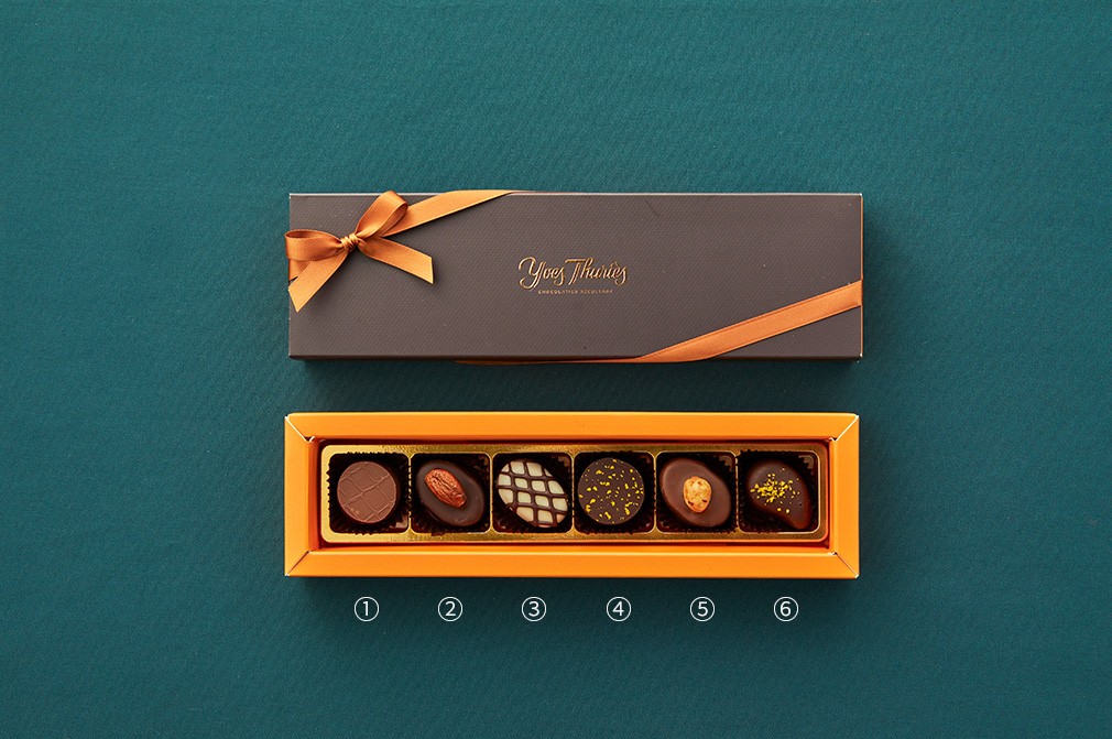 ・구성:①파레 프랄린 카푸치노 닙,②프랄린 아몬드,③헤이즐넛 초콜릿,④파레 다크 비터 가나쉬,⑤프랄린 헤이즐넛,⑥페어 위드 페어 가나쉬 다크초콜릿 각 1개입