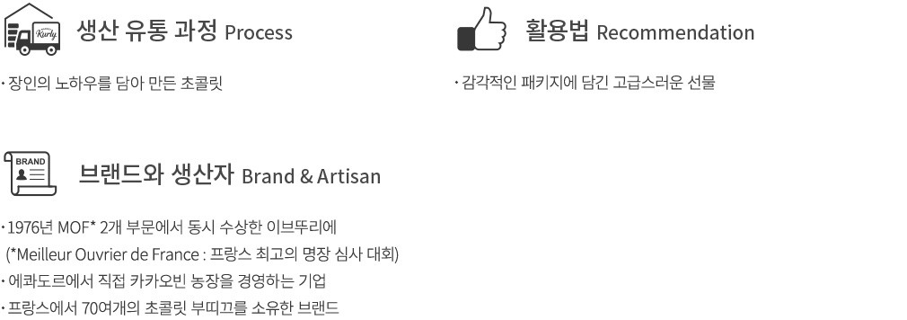 ・특징:헤이즐넛의 고소함을 품은 프랄린 초콜릿이에요. 화이트와 다크초콜릿의 부드러운 조화를 맛볼 수 있습니다.