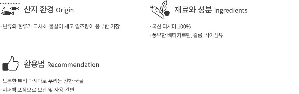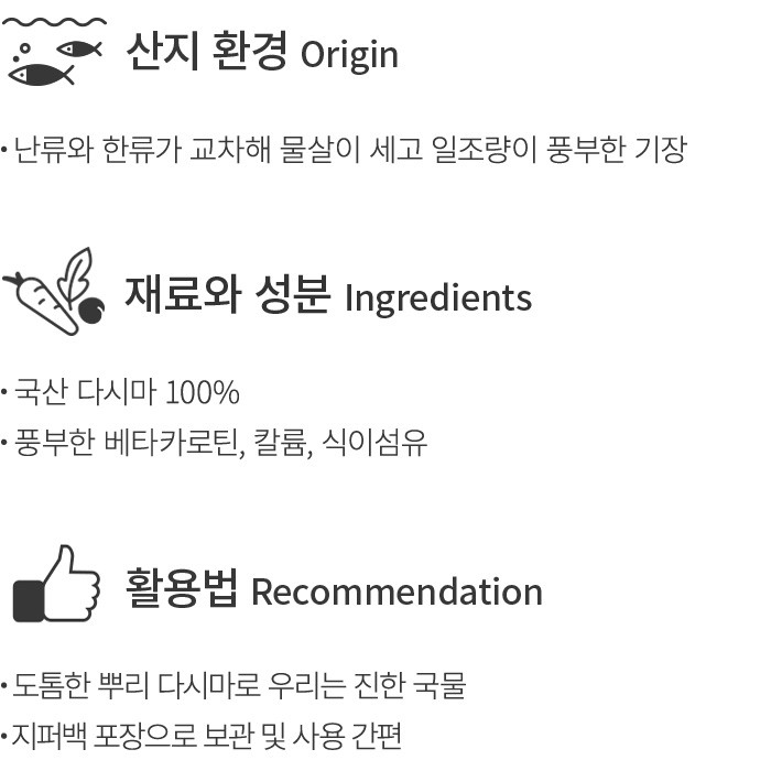 ・특징:도톰한 기장 다시마 중에서도 가장 두꺼운 뿌리 부분만 잘라 건조시킨 상품이에요. 도톰한 두께만큼이나 풍부한 진액을 품고 있답니다.