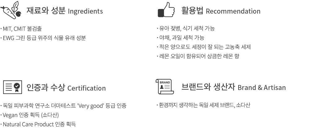 유아 식기에도 안심하고 사용할 수 있는 주방세제를 찾고 계신다면 소다산의 주방세제를 주목해 주세요. 자연 유래 성분을 함유한 비건 제품으로,설거지 후에 식기에 남아있을 잔여물에 대한 걱정을 덜어줄 거예요. MIT,CMIT가 들어있지 않아 젖병과 식기 세척,그리고 과일 세척에 이르기까지 다양하게 활용할 수 있는 세척제랍니다. 착한 성분에 상큼한 레몬 향,미끄러움을 남기지 않는 세정력까지 더할 나위 없는 소다산의 주방세제를 만나보세요.