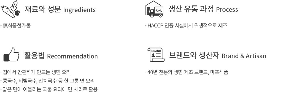 ・특징:쫄깃한 식감이 살아있는 얇은 두께의 냉사리입니다. 끓는 물에 삶은 뒤 깨끗이 헹구어 다양한 소면 요리에 활용해보세요.