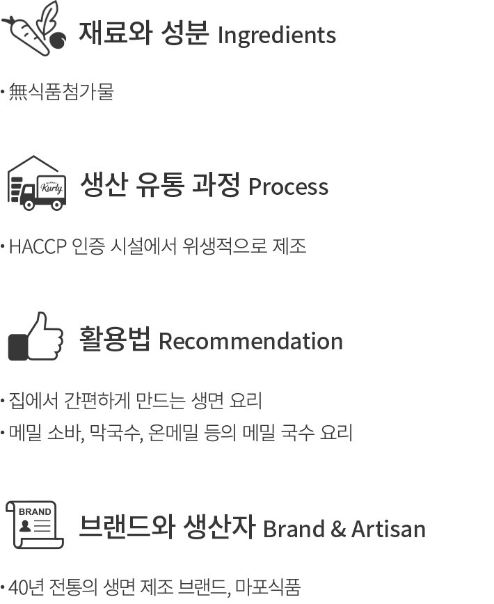 메밀 국수는 구수한 맛이 매력적이지만,다소 거칠고 끊기는 식감을 가지고 있죠. 그렇다면 메밀 향은 느껴지면서도 쫄깃하고 부드러운 국수는 어떨까요. 마포식품은 정통 수타면 비법을 사용한 생면에 메밀 특유의 맛을 더해 메밀맛 국수를 만들었어요. 입 안 가득 퍼지는 메밀 맛과 생면의 탱글한 식감까지 풍성하게 즐길 수 있답니다. 이제 다양한 메밀 국수 요리를 집에서도 간편하게 조리해보세요.