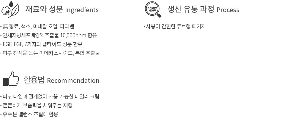 ・ 사용감:부드럽게 펴발리고 끈적임 없이 깔끔하게 흡수돼요. 촉촉한 보습감이 오래 유지됩니다.
