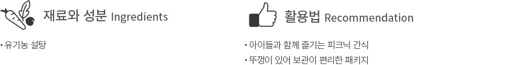 폭신폭신한 솜사탕은 아이들과 함께하는 나들이에 꼭 찾게 되는 간식이지요. 정백당이 아닌 유기농 설탕으로 만든 앙팡드봉봉의 솜사탕을 준비했어요. 돌돌 말아 한입 크기로 잘랐기에 여기저기 묻을 걱정이 없는 것은 물론,겹겹이 뜯어 먹는 재미까지 있지요. 손잡이가 달린 투명한 패키지에 차곡차곡 예쁘게 담겨 있어 선물하기에도 제격이랍니다. 취향에 맞는 솜사탕을 한입에 쏘옥 넣고 기분 좋은 달콤함을 느껴 보세요.