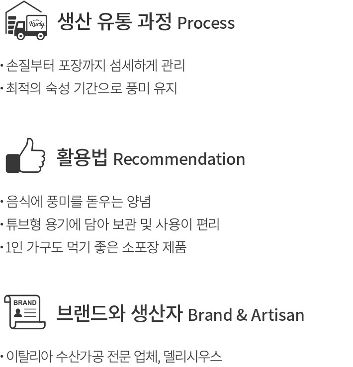 ・테이스팅 노트:앤초비를 으깬 후 담아 약간 부드러운 듯하면서도 작게 씹히는 질감,짭짤한 감칠맛이 느껴지고,올리브유의 풍미도 남아있어요.