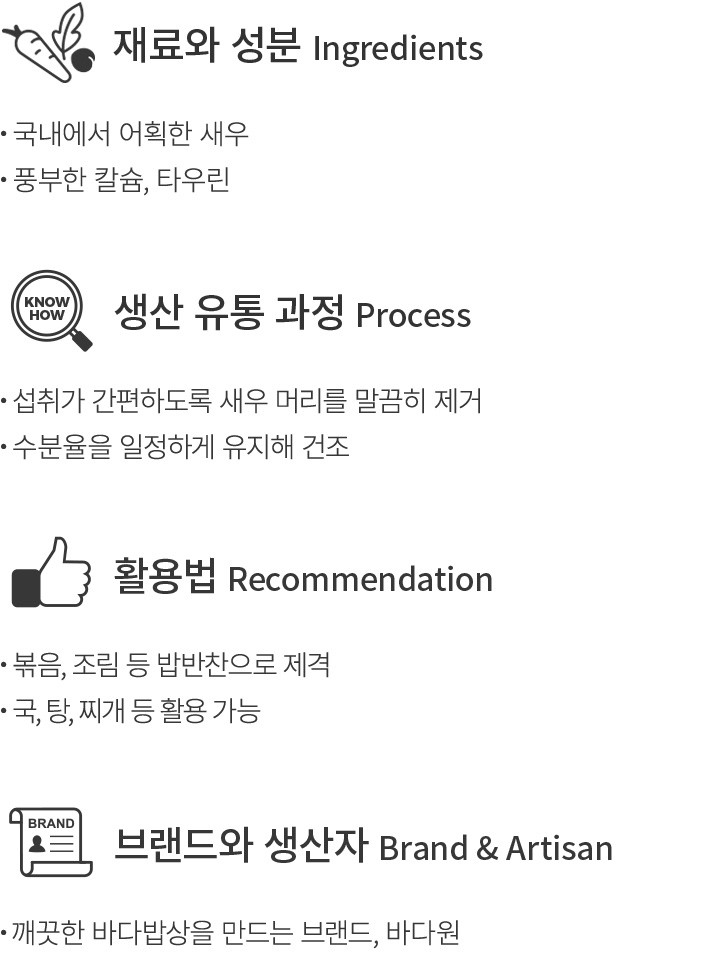 ?특징:서해에서 어획한 새우의 머리를 깨끗이 제거한 후,알맞게 건조해 포장했어요. 반찬이나 국,탕,찌개 등에 두루 활용하기 좋은 소용량 제품이에요.