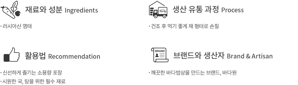 활용팁?해장국,어묵탕,매운탕 등에 뽀얀 감칠맛을 더해보세요. 별도의 손질 없이 넣어주기만 해도 시원한 국물맛이 우러납니다.