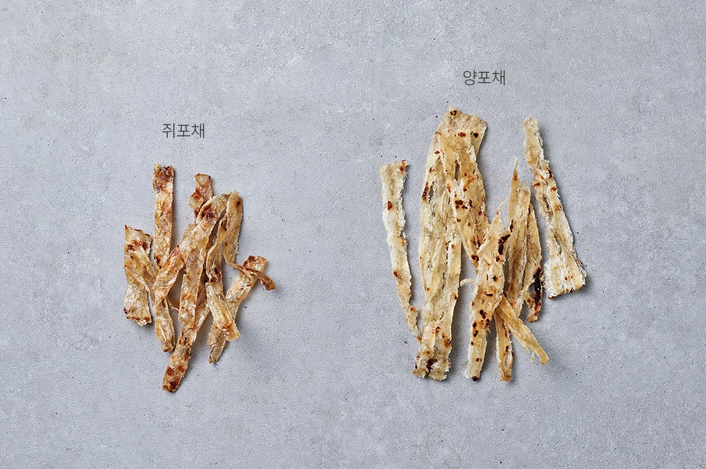 참고사항?쥐포채와 양포채를 한 눈에 비교해 보세요. 쥐포채는 한 입에 넣기 좋은 크기로 썰어냈기에 쏙쏙 집어 드시기 좋습니다.