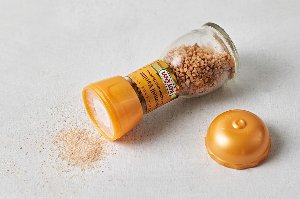 ・특징:그라인더 용기에 달콤한 카라멜 슈가 시럽과 바닐라 향료 등을 입힌 설탕이 들어 있어,필요할 때마다 갈아 분말로 사용하는 상품이에요.