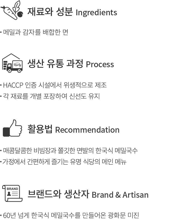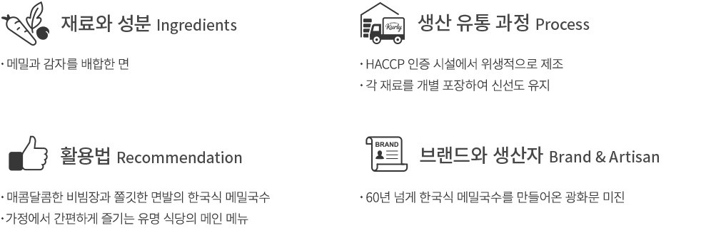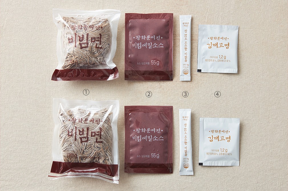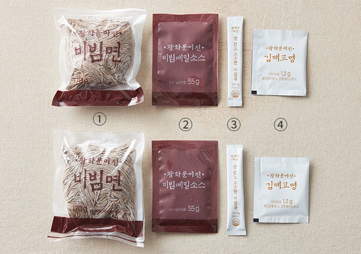 ・구성:①메밀면(170g X 2봉),②비빔소스(55g X 2봉),③비빔유(5gX2봉),④김깨고명(1.2g X 2봉)