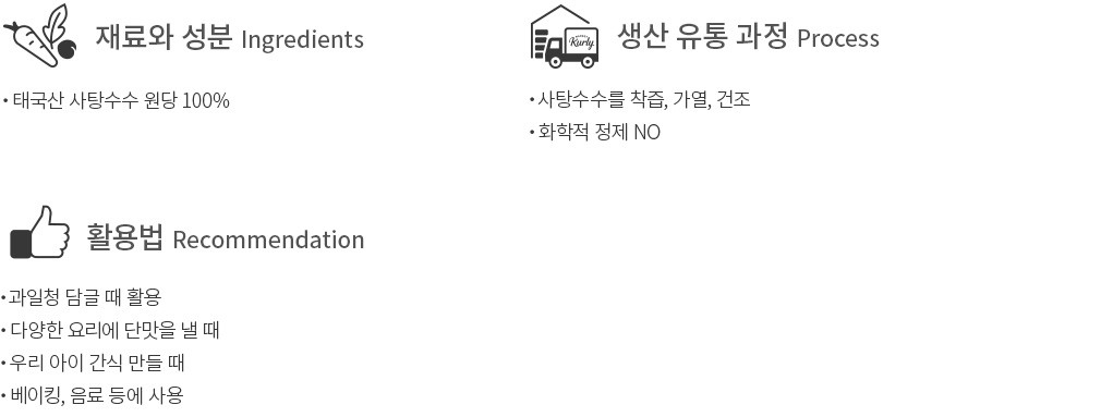 ・특징:사탕수수로만 만들어졌으며 화학 정제되지 않은 원당을 스탠드업 파우치에 포장한 상품입니다.