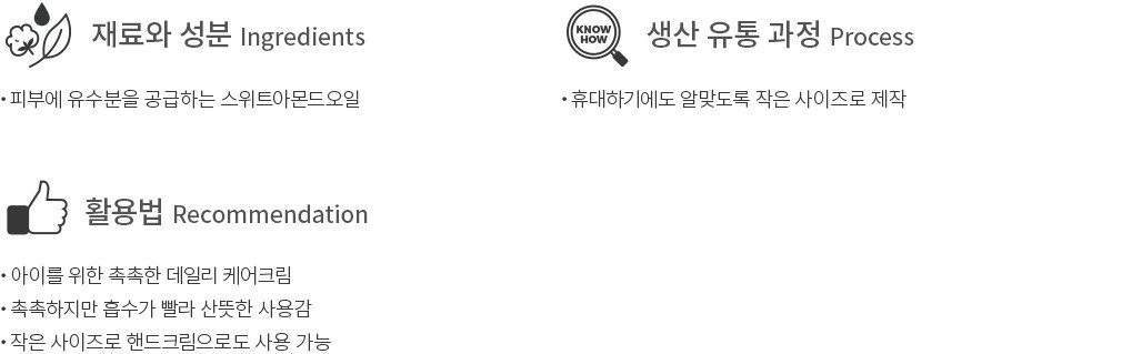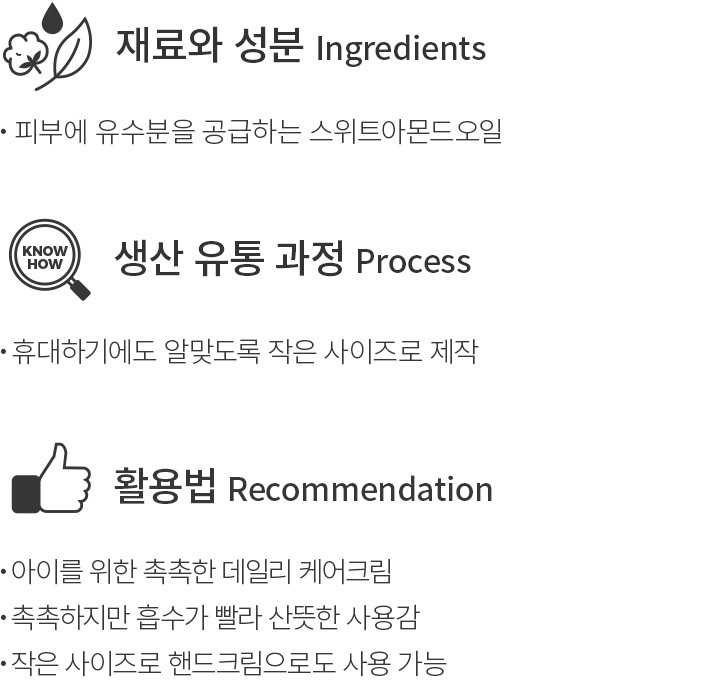・사용법:세안 또는 샤워 후 물기를 닦고,적당량을 덜어 얼굴과 전신에 발라 흡수시키세요. 아기 피부가 건조할 때마다 사용해도 좋습니다.