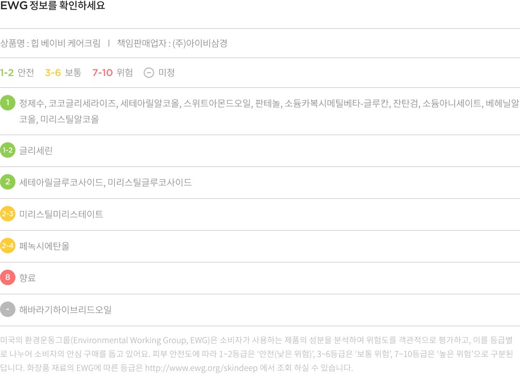 ・향료:향을 내기 위해 첨가한 성분입니다. 향료가 우려된다면 무향 제품이나 향을 내는 오일이 첨가된 제품을 사용할 수밖에 없습니다. 힙의 경우,EU에서 지정한 알레르기 유발 의심 향료를 배제하여 만들었습니다.