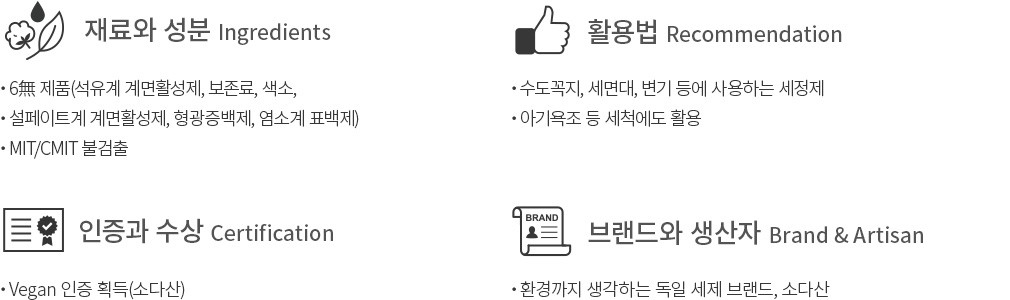 ・사용법:사용하려는 곳에 적당량을 뿌리고 10분 정도 지난 후 물로 헹구어 주세요. 오염이 심한 곳은 제품을 뿌린 뒤 30~60분간 두었다가 솔이나 천으로 문질러 닦고 물로 헹구면 됩니다.