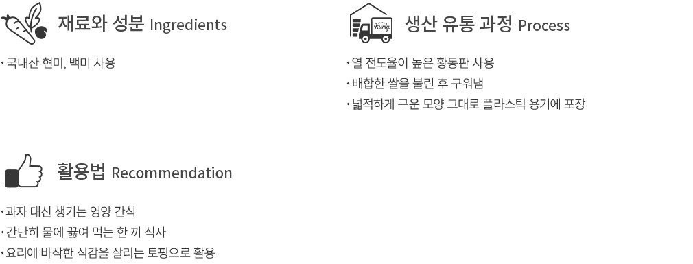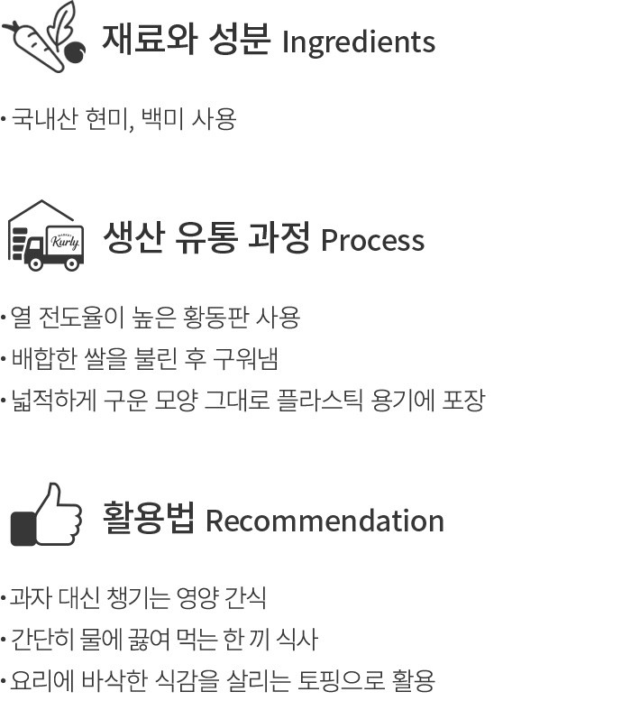 ・특징:현미의 고소한 맛과 향기가 매력적인 누룽지예요. 곡물을 불려 만든 덕분에 식감이 날카롭지 않고 부드럽답니다.