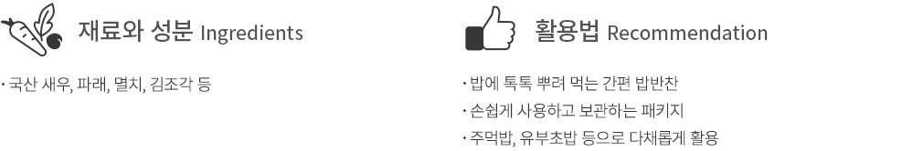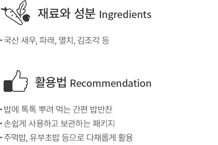 해조류를 간편하고 손쉽게 즐길 수 있는 해조랑의 밥에 뿌려먹고 비벼먹는 새우를 소개할게요. 앙증맞은 크기의 국산 새우와 파래,멸치 등의 갖가지 해산물로 만든 상품인데요. 천일염,간장 등으로 짭짤하게 간을 한 뒤,달달 볶아주었기에 더욱 맛있게 즐길 수 있답니다. 고슬고슬한 밥에 톡톡 뿌리고 조물조물 뭉쳐,주먹밥이나 유부초밥 등의 한 끼 식사를 간단하게 완성해 보세요.