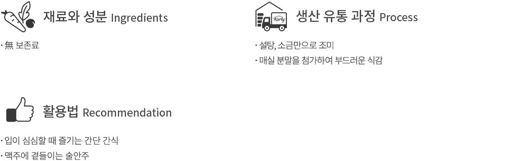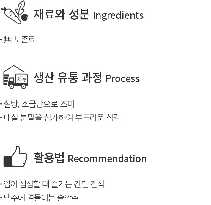 입이 심심한 순간에 꺼내 먹기에 딱 좋은 군것질거리를 만드는 주전부리마켓. 이번에 소개할 제품은 주전부리의 대표주자,담백한 쥐포랍니다. 쥐치를 국내에서 설탕과 소금만으로 조미하였어요. 눈여겨볼 점은 보존료나 식품첨가물 대신 매실 분말을 넣었다는 점이에요. 매실 분말은 연육 작용을 하여 식감을 부드럽게 하고 혹시 모를 비린내까지 잡아주죠. 드시기 직전 살짝 구우면 감칠맛이 더 살아날 거예요.