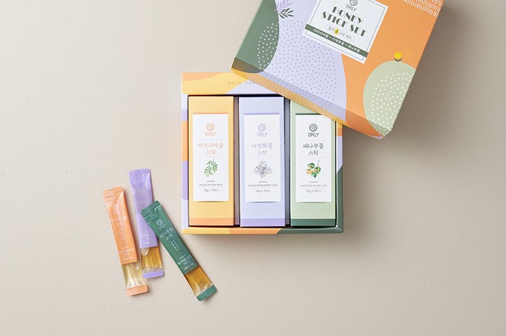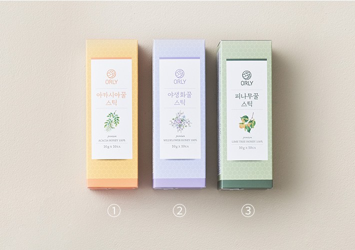 올리 꿀스틱 세트・구성:①아카시아꿀 스틱 10개,②야생화꿀 스틱 10개,③피나무꿀 스틱 10개