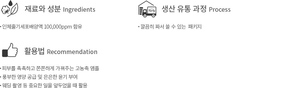 외부 환경이나 스트레스 등 다양한 요인으로 나빠진 피부 상태를 되찾기란 쉽지 않죠. 스킨 케어 루틴을 잘 지키고 있음에도 나아지지 않는다면,고농축 앰플로 집중 케어해보세요. 줄기세포배양액을 포함해 세라마이드,판테놀 등 보습 성분을 꼼꼼히 배합한 제품인데요. 피부 깊숙이 수분과 영양을 전달해 오래도록 촉촉한 피부를 선사한답니다. 중요한 일정을 앞두고 있다면 함께 드리는 제트플러스 마스크팩으로 마무리해보세요. 시너지를 발휘해 피부 컨디션을 더욱 높여줄 거예요.