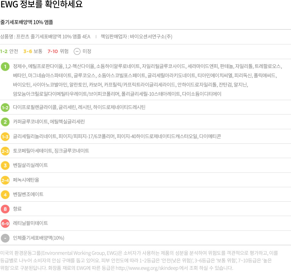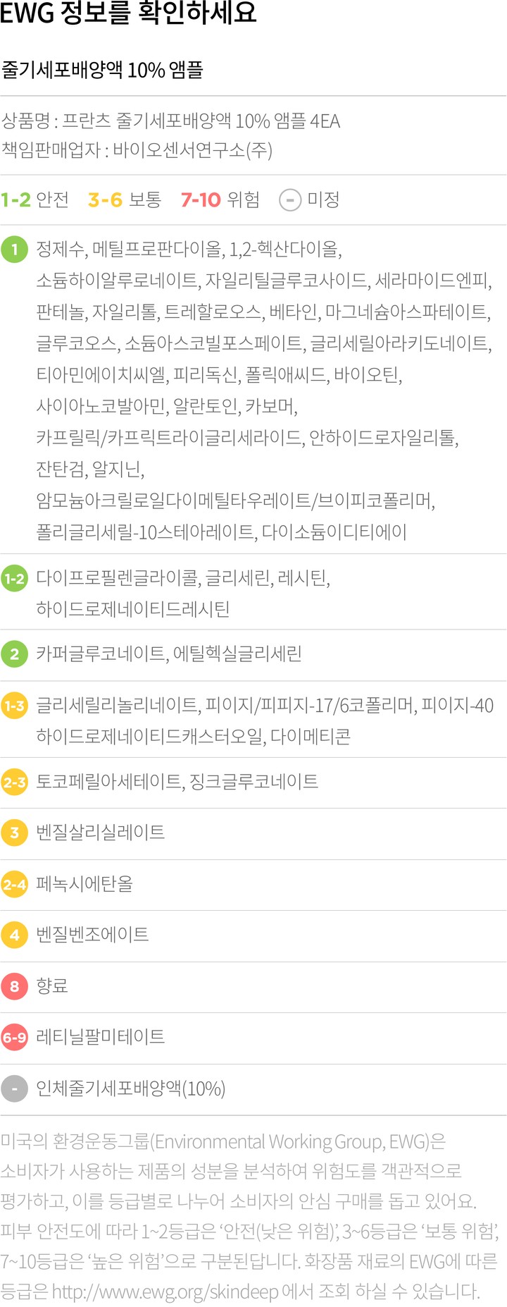 EWG에 대한 컬리의 생각 컬리는 화장품,샴푸,치약,세제 등 우리의 인체에 닿는 리빙 제품의 전성분을 공개하고 성분의 위험 정도를 EWG 기준에 따라 1~10 숫자로 안내하고 있습니다. EWG가 세계적으로 널리 사용되는 신뢰할 수 있는 척도인 것은 맞지만,상품의 안전성을 증명하는 절대적인 기준은 아니에요. EWG로부터 좋지 못한 평가를 받은 성분에 대해 전문가와 유관기관은 '권고 기준치를 지켜 사용할 경우 무해하다'고 평가하기도 합니다. 이에 컬리는 EWG 등급과 인터넷에 떠도는 단편적인 정보에만 의존하지 않고 식품의약품안전처,에코서트(ECOCERT),미국식품의약국(FDA),미국화장품원료검토위원회(CIR)등 공신력 있는 인증기관의 의견을 참고하여 유해성 여부를 꼼꼼하게 따져 보고 있습니다.