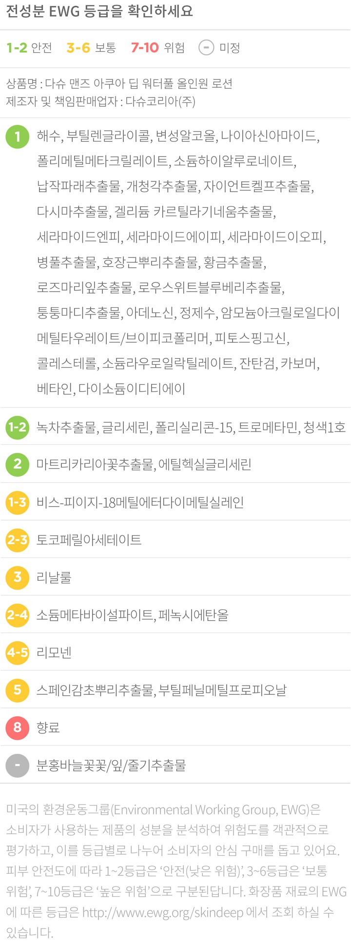 컬리는 EWG로부터 보통,위험 등급을 받은 성분이라 하더라도 숨기지 않고 정직하게 공개합니다. 더불어 우려되는 성분에 대한 정보를 함께 제공해 드리오니 구입 전 반드시 확인해 주세요.